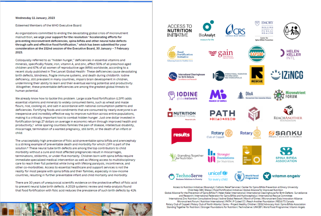 With your support by co-signing this letter, you will join IF and other international partners in advocating for this important resolution that will help to  improve and implement large-scale food fortification (LSFF) with vitamin B9 (folic acid) to reduce the risk of Spina Bifida, Anencephaly, or Encephalocele.