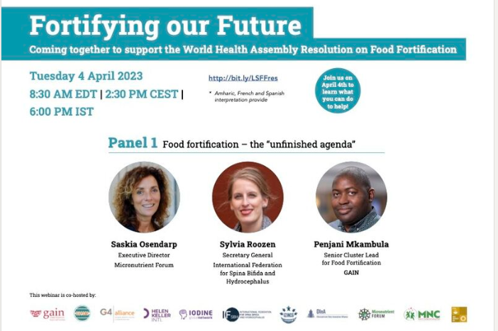 The webinar ‘Fortifying our Future: Coming together to support the World Health Assembly Resolution on Food Fortification’, held on 4 April 2023, was hosted by Global Alliance for Improved Nutrition (GAIN) in collaboration with the International Federation for Spina Bifida and Hydrocephalus, GAPSBi-F, G4 Alliance, Helen Keller Intl, Micronutrient Forum, Mighty Nutrients Coalition, SDG2 Advocacy Hub, Iodine Global Network, iZincG and Micronutrient Data Innovation Alliance. The webinar aimed to bring together a diverse coalition of advocates and stakeholders, such as experts in the fields of disability rights, neurosurgery, micronutrient malnutrition, food fortification, public health, and fortified food production to support the WHA food fortification initiative, as well as, to maximise the impact of the proposed resolution, ‘Accelerating efforts for preventing micronutrient deficiencies and their consequences, including spina bifida, and other neural tube defects, through safe and effective food fortification’.