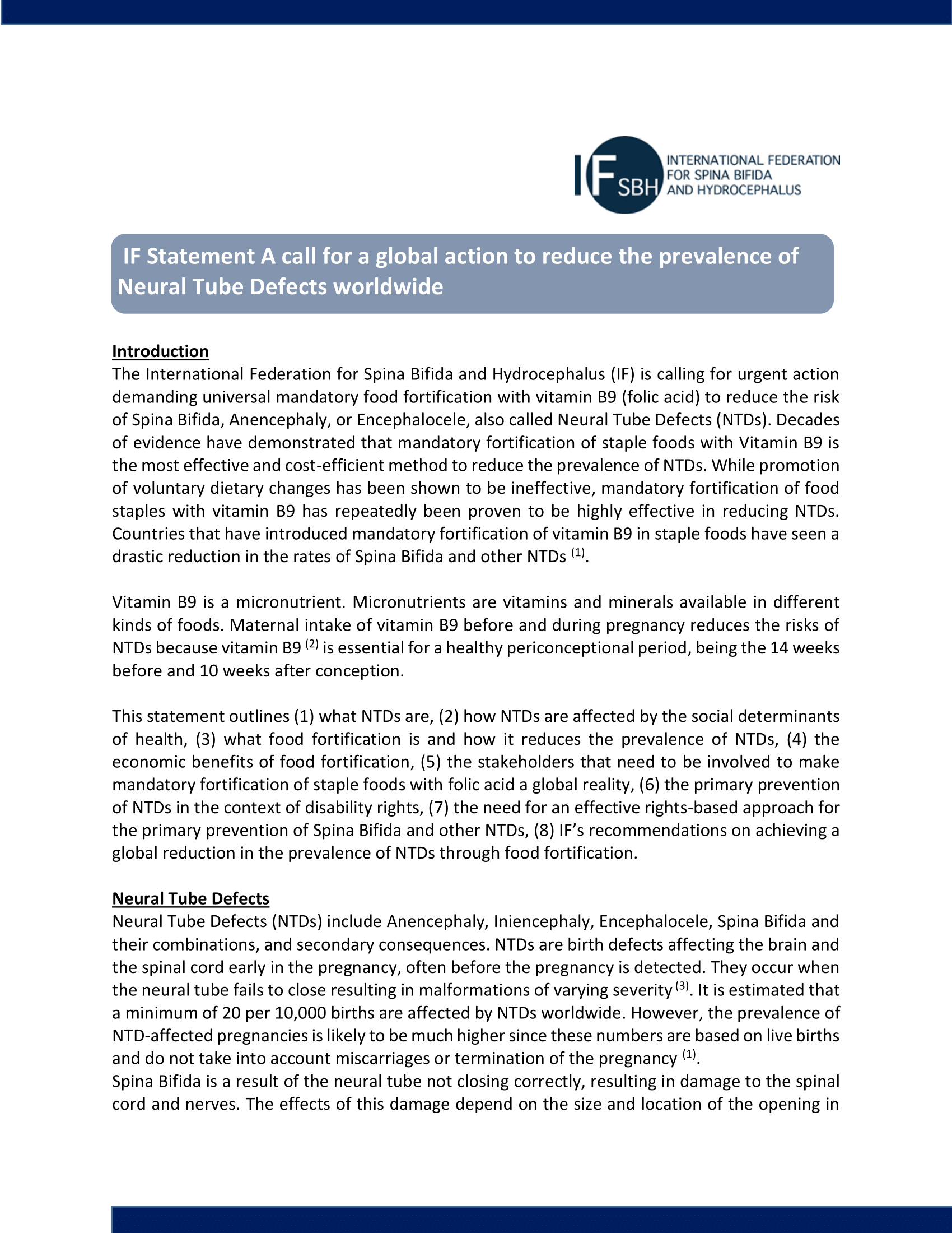 With a new IF statement, The International Federation for Spina Bifida and Hydrocephalus (IF) is calling for urgent action demanding universal mandatory food fortification with vitamin B9 (folic acid) to reduce the risk of Spina Bifida, Anencephaly, or Encephalocele, also called Neural Tube Defects (NTDs).