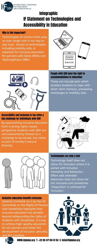 The topic of technology and education brings to light a lot of important issues which are at the core of the rights of persons with disabilities and the challenges that the SBH community encounter day to day. Subsequently, IF has published a statement on technologies and accessibility in education.