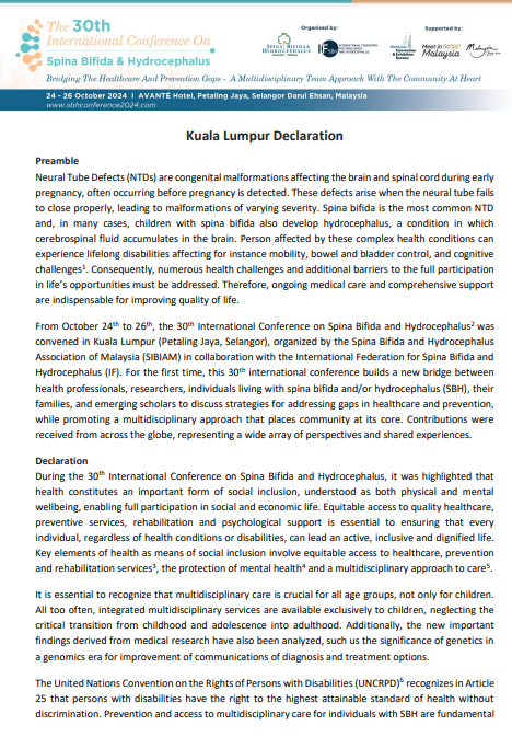 The 30th International Conference on Spina Bifida and Hydrocephalus, convened in Kuala Lumpur from October 24th to 26th, resulted in a historic declaration that calls for global action to improve the prevention of Neural Tube Defects (NTDs) and ensure continuous, coordinated, and inclusive multidisciplinary care for individuals affected by spina bifida and /or hydrocephalus (SBH) throughout all stages of life, from childhood to adulthood. This event brought together experts, researchers, healthcare professionals, members of the SBH community, and their families to discuss solution that can break down barriers and improve quality of life.