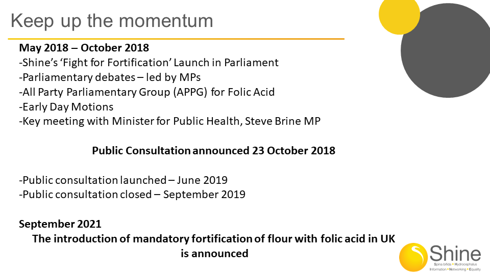 Kate Steele (affiliation) spoke about a 30-year long journey in making fortification a priority in the UK. Since 2017, SHINE has tremendously worked on folic acid awareness and reached the decision-makers to unlock the prevention of Spina Bifida through mandatory fortification. In 2018, SHINE reached the Parliament with their ‘Fight for Fortification’ campaign which later led to a public consultation in June 2019. The consultation closed in September 2021 with the introduction of mandatory fortification of flour with folic acid in the UK.
